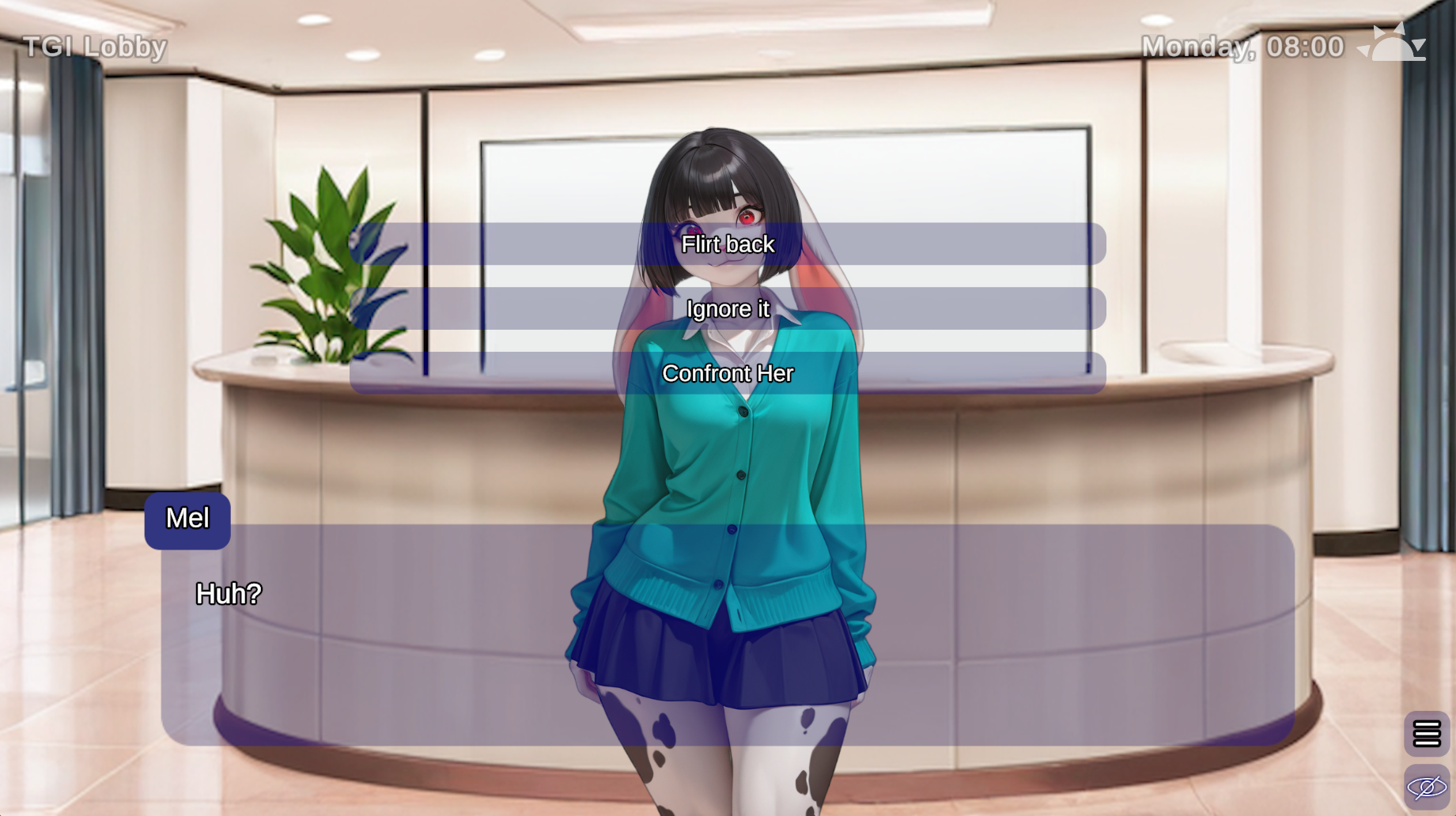 Another feature that'd be nice and not one I see often in VNs with branching choices is a "map" that you unlock once you complete an ending that shows/hints at all the possible paths the player can take.I didn't mention it before, but all of the characters are pretty great so far. I like that Mei is the only character out of the ones present that immediately tries to get into MC's pants. It makes her feel like a more interesting character, especially with Bridgett even giving you a warning about her behaviour. A lot of VN's would've gone out of their way to have a scene with both Bridgett and Sammy in that time frame, and I'm glad you chose not to do that. I love slow burn stuff like that!