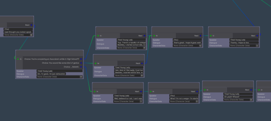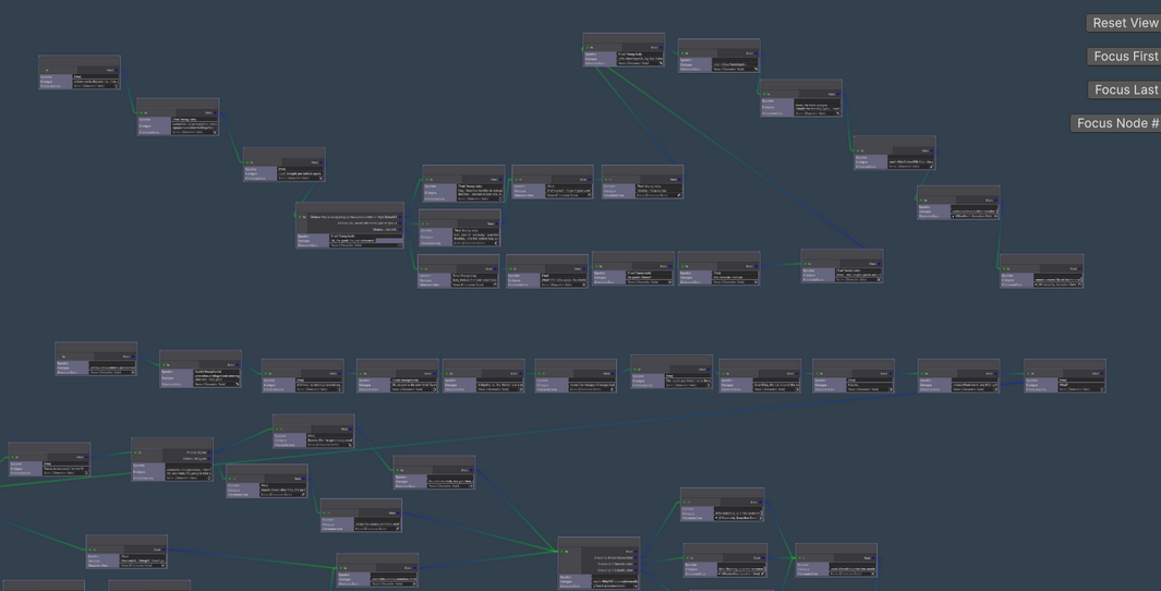 But thankfully it hasn't taken too much time from future development and I've developed a lot of tools to help me out. For example, internally I use a custom Unity Graph system to route the dialogue and set up conditions and whanot, here's what that looks like: